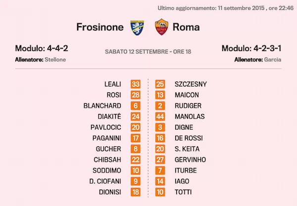Serie A 2015-2016, terza giornata: le probabili formazioni dei 10 match in programma. Si parte con le due gare di sabato alle 18, Frosinone-Roma e Fiorentina-Genoa, chiuderà la giornata di campionato l’attesissimo derby di Milano domenica sera alle 20.45.