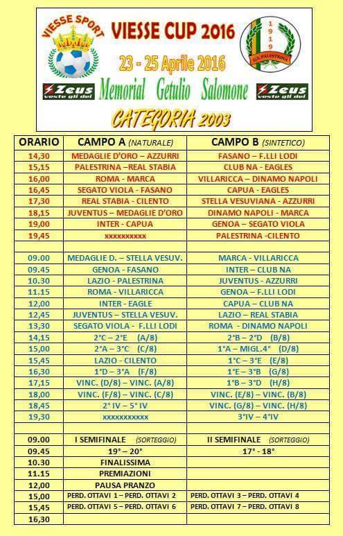 Il prossimo 23 aprile prenderà il via la “Viesse Cup 2016 – Memorial Getulio Salomone”, per la categoria 2003. Il primo match ci sarà alle 14.30 di sabato prossimo, la finalissima, invece, si giocherà lunedì 25 aprile alle 10.30. Il torneo è organizzato da Stefano Cirillo, ideatore della VieSseSport insieme a Vincenzo Raiola, con la collaborazione di Roberto Tota della società US Palestrina Calcio.