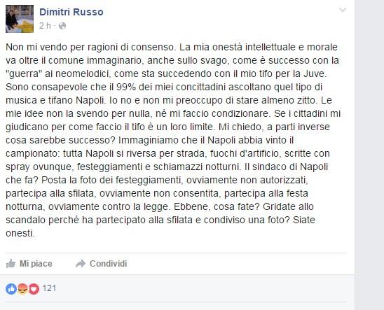 LA RISPOSTA – Russo è inoltre intervenuto con ulteriori stati su Facebook in cui ha spiegato il suo punto di vista, evidenziando l’ipocrisia creatasi attorno a tale situazione. Il sindaco ha avuto anche abbastanza coraggio nell’esporsi chiaramente datosi che i riscontri a suo favore, come facilmente pronosticabile, sarebbero stati ben pochi. Ecco di seguito lo stato in cui maggiormente espone il suo pensiero: