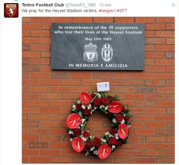 Allo stadio si va dopo il lavoro, per svagarsi e divertirsi. Mai per scappare, rifugiarsi, aver paura. Oggi chi ha a cuore questi concetti dedica un pensiero alle trentanove vittime di quella sciagurata finale di Coppa Campioni. Anche il Torino, separato dai colori della Juventus da rivalità sportiva, dedica un pensiero sul suo profilo Twitter, così come la Juventus aveva lasciato un personale messaggio il 4 maggio, in occasione della commemorazione delle vittime di Superga.