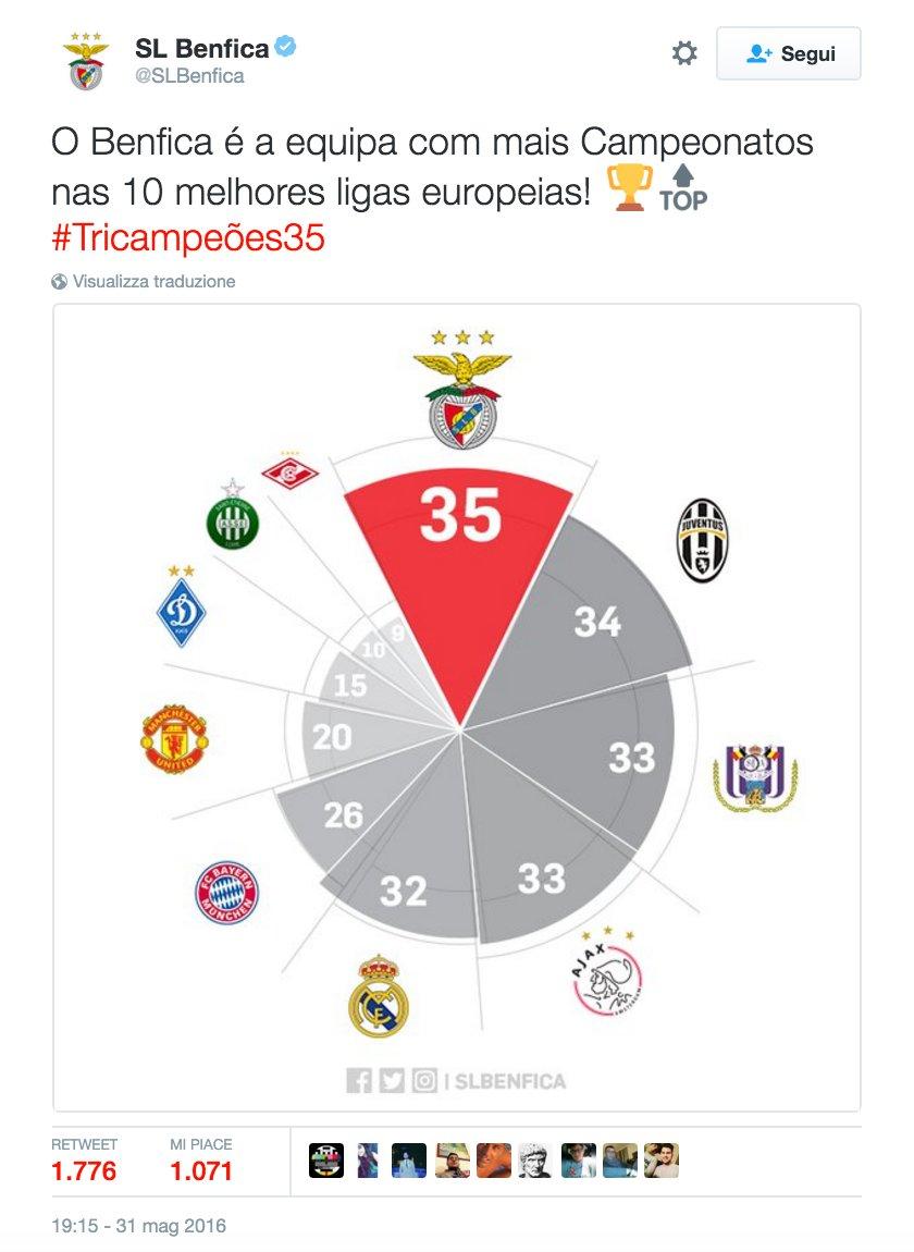 Un tweet destinato a far scatenare polemiche. Il Benfica, infatti, tramite il proprio profilo ufficiale, ha “cinguettato” una foto in cui dichiara di essere la squadra che ha vinto più titoli nazionali nei dieci maggiori campionati europei.