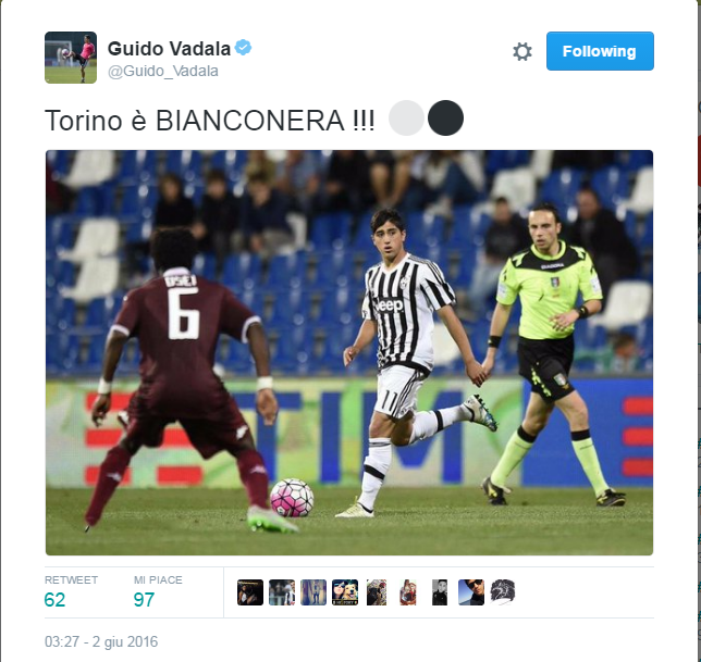 TWEET JUVENTINO – Nonostante non sia stato protagonista in campo, Guido Vadalà ha sentito molto il derby, e dopo la vittoria, ha pubblicato una foto che lo ritrae sul rettangolo verde con una didascalia da vero tifoso: “Torino è bianconera!”. L’argentino, arrivato a Torino nell’ambito dell’operazione che ha riportato Tevez al Boca, si sta pian piano ambientando alla Juventus, e tutti i tifosi bianconeri sperano che possa essere decisivo sia nell’atto finale contro i giallorossi, ma anche in futuro, con la maglia della squadra maggiore bianconera.