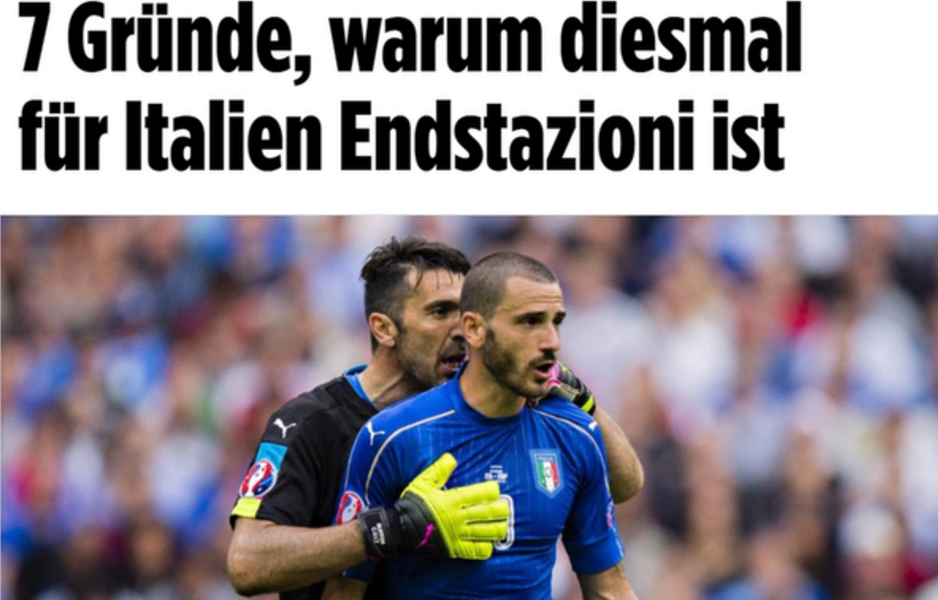 L’Italia non ha nessuna speranza contro la Germania. Ne è sicura la Bild, che titola “Ultima fermata per gli azzurri”, elencando i sette motivi per i quali Conte e i suoi uomini non avrebbero speranze contro la nazionale campione del mondo in carica.