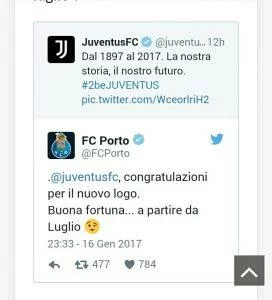 Il Porto, prossimo avversario della Juventus in Champions League, in maniera simpatica ha voluto prendere in giro i bianconeri con questo cinguettio su Twitter: “Congratulazioni per il logo. Buona fortuna, a partire da luglio”.