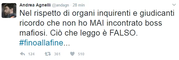 Poco dopo la diffusione della notizia, però, è arrivata la replica su Twitter da parte del presidente della Juventus: “Nel rispetto di organi inquirenti e giudicanti ricordo che non ho MAI incontrato boss mafiosi. Ciò che leggo è FALSO”, ha scritto il numero uno dei bianconeri.