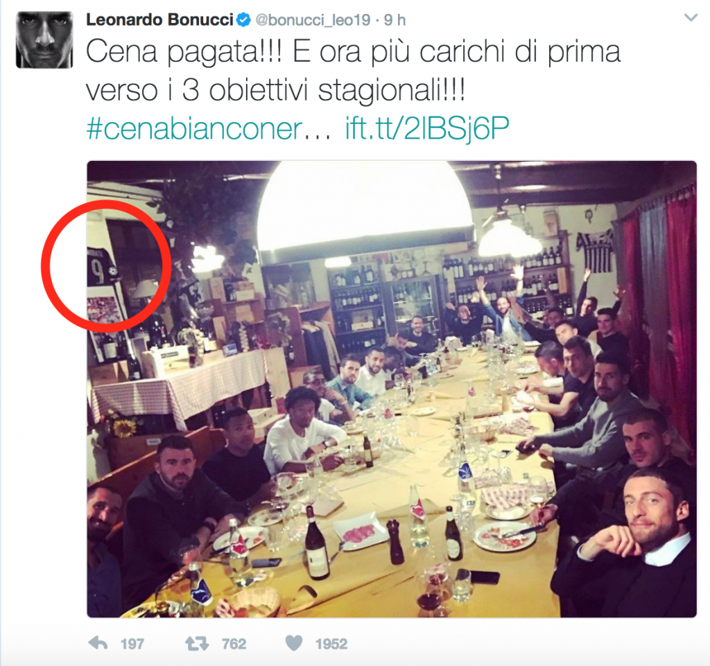 Un particolare, del tutto casuale, ha divertito non poco i tifosi della Juventus. Nel ristorante scelto da Bonucci per la cena, infatti, è affisso, alle spalle dei giocatori, un quadretto con la maglia numero 9 di Alvaro Morata.