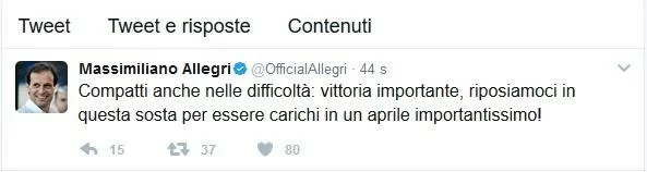 Allegri su Twitter ribadisce che il mese di aprile sarà importantissimo per la lotta sui tre fronti. Questa pausa arriva nel momento giusto, utile per ricaricare le pile.