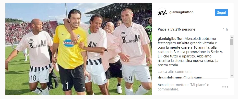 Maggio è il mese in cui è più facile ricordarsi le vittorie, in quanto arrivano tutte in quel periodo: il famoso 5 maggio, la Champions vinta nel ’96 a Roma, la miriade di scudetti e Coppe Italia.. la storia della Juve è piena di questi ricordi. Uno, meno ricordato ma sicuramente da rimarcare, fu quel giorno, in quello stadio un po’ anonimo che è il Città di Arezzo (per l’appunto ad Arezzo): l’avversario era proprio la squadra granata, l’allenatore, strano ma vero, Antonio Conte. La partita terminò 5-0 per i bianconeri, e quella vittoria valse la promozione in serie A. Era l’anno della B, con Boumsong e Kovač in difesa, Paro a centrocampo e Palladino pronto a sostituire Del Piero e Trezeguet. Buffon, campione del mondo a Berlino nel 2006, difendeva i pali di quella Juventus, e oggi, a distanza di 10 anni, ricorda così quel giorno su Instagram.