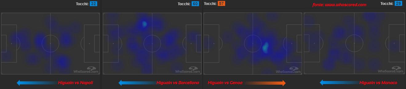 Chiamato per segnare, ma non solo. Higuaín in questa prima stagione ha svolto un lavoro per la squadra che, probabilmente, non effettua nessun calciatore al mondo. Fa sentire la sua presenza in area, aiuta la squadra a salire, ma spesso lo si trova anche a giocare da trequartista, come accadeva ai tempi del River, quando la prima punta era uno tra Farias e Figueroa. A tratti, per favorire Dybala in profondità, si sono viste azioni molto simili a quelle della prima Juventus di Allegri, con Morata sempre pronto a venire incontro al centrocampo per liberare lo spazio a Tevez. Emblematiche in questo senso sono la semifinale di ritorno con il Napoli, le gare contro il Barcellona al Camp Nou e allo Stadium con il Genoa, oltre alla semifinale d’andata con il Monaco: dalle heat map è possibile notare come Higuaín abbia arretrato in maniera efficace il proprio raggio d’azione, riuscendo ad adattarsi alla perfezione anche ad uno stile di gioco come quello bianconero.
