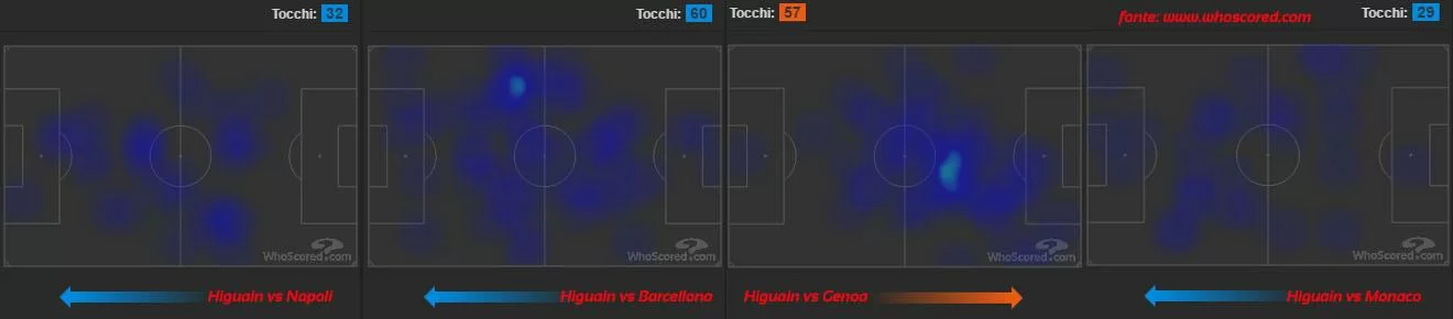 Chiamato per segnare, ma non solo. Higuaín in questa prima stagione ha svolto un lavoro per la squadra che, probabilmente, non effettua nessun calciatore al mondo. Fa sentire la sua presenza in area, aiuta la squadra a salire, ma spesso lo si trova anche a giocare da trequartista, come accadeva ai tempi del River, quando la prima punta era uno tra Farias e Figueroa. A tratti, per favorire Dybala in profondità, si sono viste azioni molto simili a quelle della prima Juventus di Allegri, con Morata sempre pronto a venire incontro al centrocampo per liberare lo spazio a Tevez. Emblematiche in questo senso sono la semifinale di ritorno con il Napoli, le gare contro il Barcellona al Camp Nou e allo Stadium con il Genoa, oltre alla semifinale d’andata con il Monaco: dalle heat map è possibile notare come Higuaín abbia arretrato in maniera efficace il proprio raggio d’azione, riuscendo ad adattarsi alla perfezione anche ad uno stile di gioco come quello bianconero.