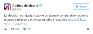 L’organo internazionale ha accolto solo in parte il ricorso dei colchoneros, confermando però l’impossibilità di acquistare nuovi giocatori fino al gennaio 2018. Un bella tegola per il Cholo Simeone che potrà ora contare solamente sul rientro dei giocatori in prestito come Kranevitter e Diogo Jota.