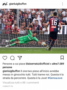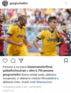 Giorgio Chiellini esprime il suo punto di vista subito dopo il match contro il Genoa, vinto 4-2 dalla Juve. Si soffre, si va sotto col risultato, si rischia di perdere la partita e i tre punti, e allora si cerca subito di recuperare. Alla Juve funziona così da sempre, non ci si deve mai arrendere. Si è dovuto credere nella vittoria fino alla fine, per ribaltare un risultato che sembrava scritto, e che per come si è consumato (due gol dopo pochi minuti dall’inizio della partita) avrebbe senza dubbio abbattuto il morale di molte altre squadre. Proprio su questo aspetto si è soffermato il Capitano Gigi Buffon, nelle sue esultanze social.