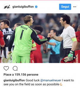 Non poteva mancare l’augurio di pronta guarigione del Numero Uno Gianluigi Buffon, che tramite i suoi profili social, scrive all’amico e avversario sul campo: “Good luck Manuel Neuer. I want to see you on the field as soon as possibile“. La speranza di Gigi è che possa rivedere il portierone tedesco sul campo di gioco il prima possibile. Come sempre, espressione di massima sportività per chi nel calcio è in cima ad ogni possibile classifica.