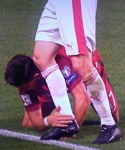 Il capitano della Svizzera e terzino destro della Juventus, è stato protagonista di un episodio spiacevole: contatto volontario tra il suo ginocchio e la tempia di André Silva, attuale attaccante del Milan, conclusosi con un pestone dello svizzero. Niente di grave per fortuna, anche perchè lo stesso Silva sigla il gol del raddoppio appena un paio di minuti più tardi. Questo fine settimana torna la Serie A, e loro ci hanno dato un assaggio di Milan-Juve.