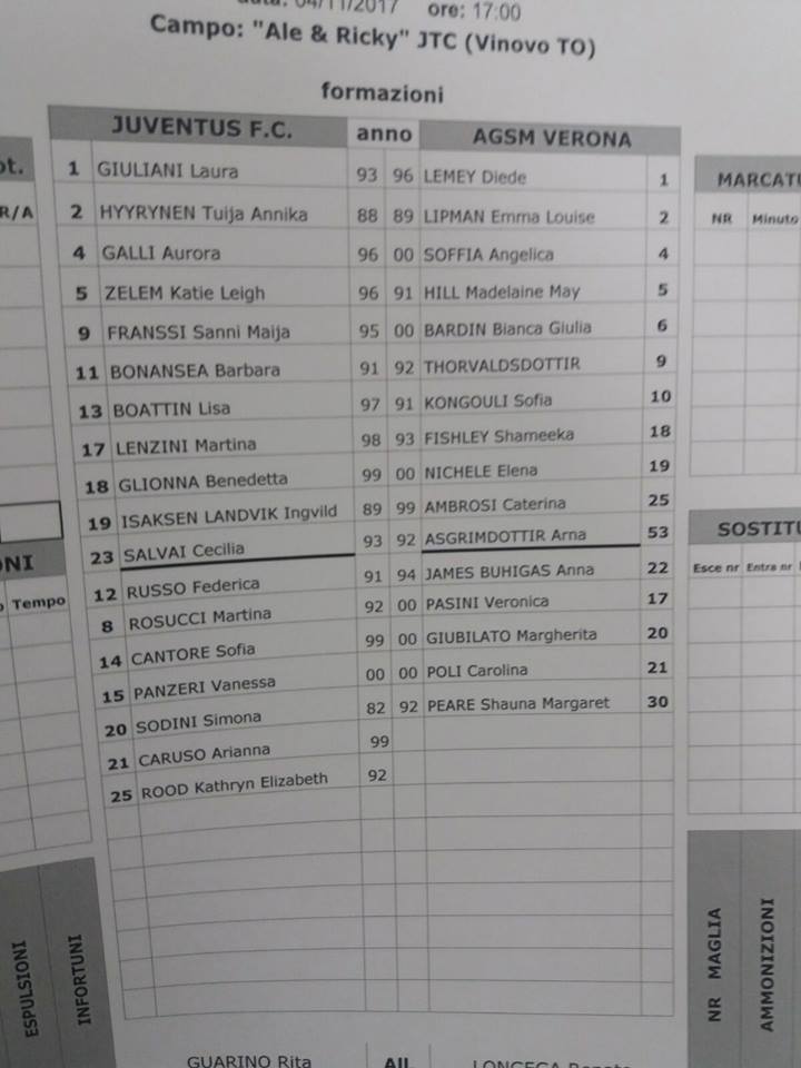 JUVENTUS WOMEN: Giuliani; Hyyrynen, Salvai, Lenzini, Boattin; Galli, Isaksen (55′ Rosucci); Glionna, Zelem (65′ Caruso), Bonansea; Franssi (75′ Cantore)