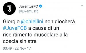 Aggiornamento 16:00 – Tramite un tweet del profilo ufficiale la Juventus ha fatto sapere che Giorgio Chiellini non sarà della partita. Il difensore sarà costretto a saltare la sfida a causa di un risentimento muscolare alla coscia sinistra.