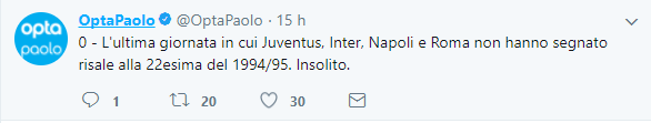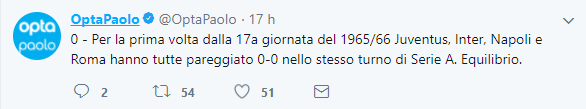 Dobbiamo tornare indietro di 52 anni per evidenziare una giornata senza successi o sconfitte da parte delle stesse quattro squadre. Era dalla stagione 1965/66 che Juventus, Inter, Napoli e Roma non terminavano un turno di campionato con lo stesso identico segno X.