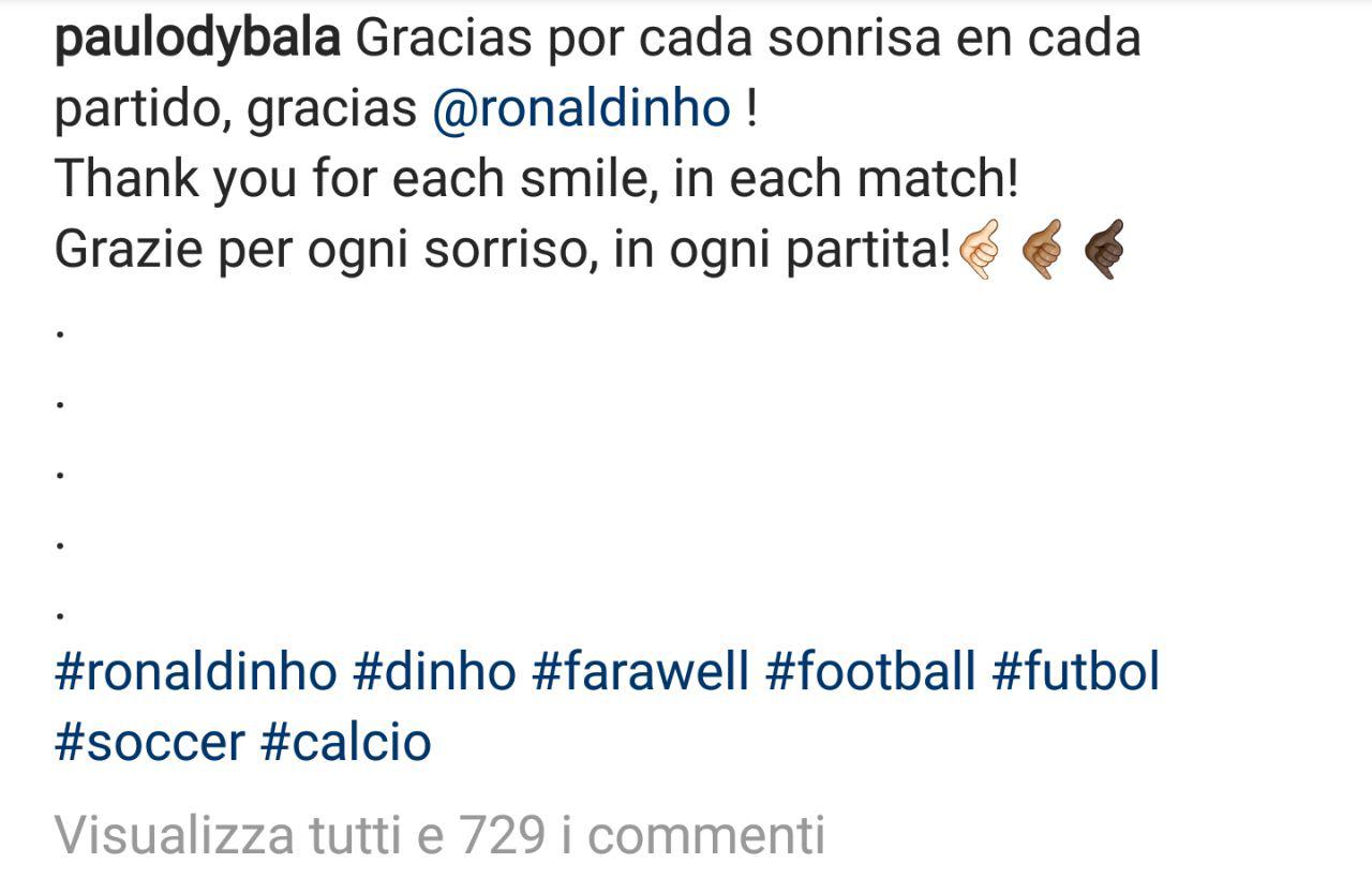 Argentina e Brasile non vanno storicamente molto d’accordo, soprattutto quando si parla di calcio. Ma se a dare l’addio al calcio giocato è un fenomeno del calibro di Ronaldinho, un altro fenomeno, la Joya bianconera Paulo Dybala, non può che portare rispetto, e magari rivedere qualche suo gol per imparare certe mosse dal Gaucho e perfezionarsi ancora di più, tecnicamente. I due giocatori hanno caratteristiche diverse ma non sono poi così tanto lontani, almeno sul campo da gioco. Vedere una loro partita insieme sarebbe stato niente male…