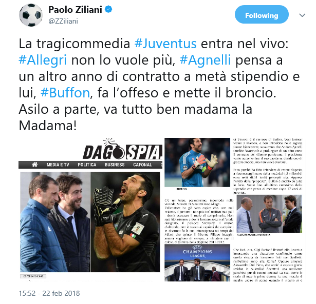 Prendendo “in prestito” un articolo di Dagospia, Ziliani fa il punto – a modo suo – sulla situazione Buffon, non risparmiando nessuno: né Allegri, né Agnelli, né tantomeno il portierone bianconero…