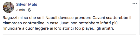 “Ragazzi mi sa che se il Napoli dovesse prendere Cavani scatterebbe il clamoroso contrordine in casa Juve: non potrebbero infatti più rinunciare a cuore leggero ai loro storici top player… gli arbitri”, ha scritto sul suo profilo Facebook.