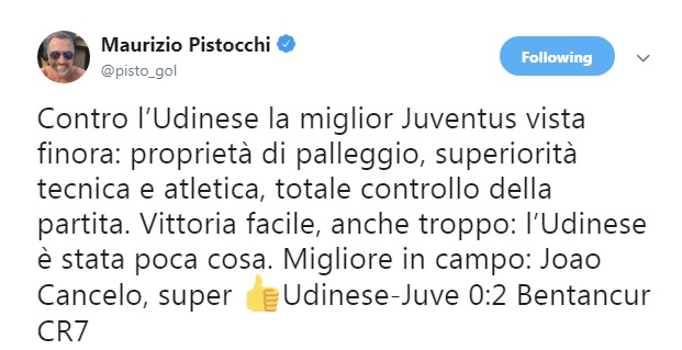 Questo il commento: “Contro l’Udinese la miglior Juventus vista finora: proprietà di palleggio, superiorità tecnica e atletica, totale controllo della partita. Vittoria facile, anche troppo: l’Udinese è stata poca cosa. Migliore in campo: Joao Cancelo, super 👍Udinese-Juve 0:2 Bentancur CR7“.