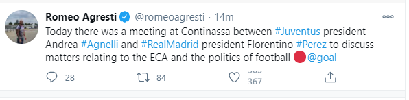 Secondo quanto riportato da Romeo Agresti sul suo profilo Twitter, nella giornata odierna alla Continassa c’è stata una riunione tra Andrea Agnelli e il presidente del Real Madrid, Florentino Perez, per discutere di questioni relativi all’ECA e alla politica del calcio.