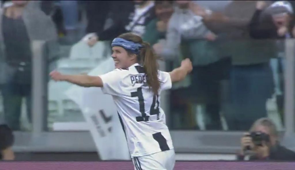 Dopo due traverse di Cristiana Girelli e un palo di Alia Guagni la scena se al prende l’ultima arrivata: la danese Sofie Junge Pedersen. Ma torniamo indietro: tutto parte dal mancino di Lisa Boattin, crossa in mezzo all’area di rigore a cercare la testa di Cristiana Girelli. Il portiere viola sbaglia l’uscita e sbuca Sofie Junge Pedersen che da due passi insacca il pallone ed è uno a zero Juventus. L’eroe di giornata sarà proprio la giocatrice danese arrivata nel mercato di gennaio. L’intero Stadium è in festa: tutti esultano perché è il coronamento di quella giornata la vittoria sulla Fiorentina.