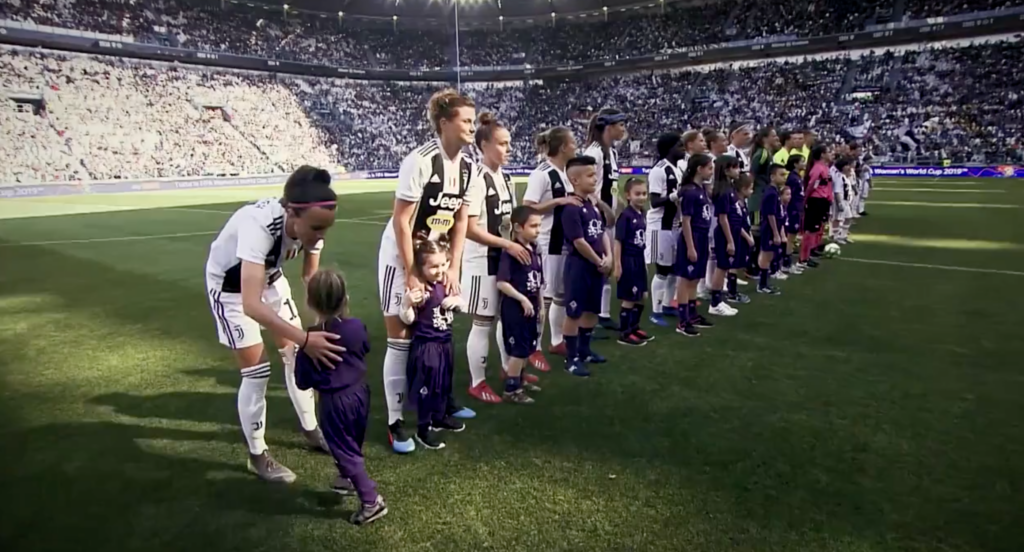 Lo speaker dello Stadium inizia a urlare i nomi delle 11 bianconere che scenderanno in campo: “Con il numero uno Laura…” e il pubblico prosegue “Giuliani”. Un brivido percorre la schiena, abituati a sentire “Con il numero 1 Gianluigi Buffon”. Il secondo ricordo è l’ingresso in campo delle ventidue giocatrici, ognuna di loro accompagnata da un bambino o bambina con la divisa della squadra avversaria. Particolare attenzione a Cristiana Girelli, il bomber bianconero ha infatti scelto la nipotina “Chicca” per accompagnarla in campo in un’occasione così speciale. Sappiamo che Cristiana è molto affezionata alla nipote, successivamente ha raccontato il timore che la piccola Chicca potesse piangere e sentire la mancanza della mamma durante l’attesa di “zia Cri” per l’ingresso in campo e invece era contentissima di poter accompagnare la zia in questa sua grande giornata. Un trionfo nel trionfo dunque.