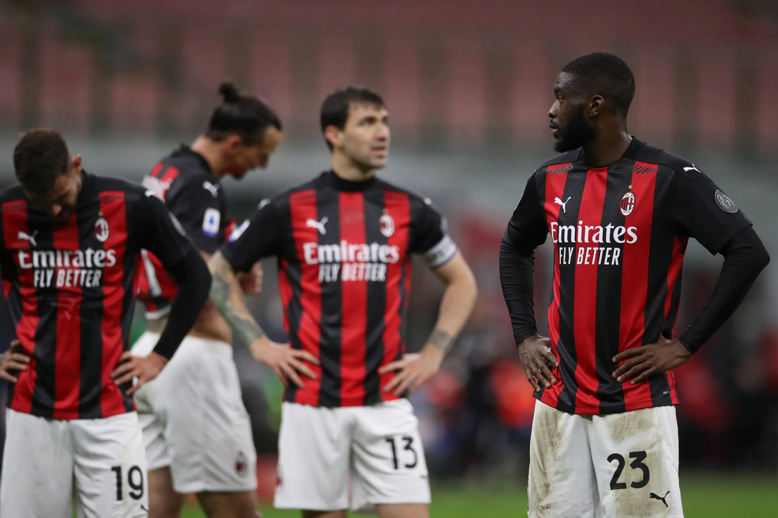 Milan, Italy, 1st May 2021. Fikayo Tomori of AC Milan looks towards team mates Theo Hernandez, Alessio Romagnoli and Zlatan Ibrahimovic during the Serie A match at Giuseppe Meazza, Milan. Picture credit should read: Jonathan Moscrop / Sportimage PUBLICATIONxNOTxINxUK SPI-1027-0034