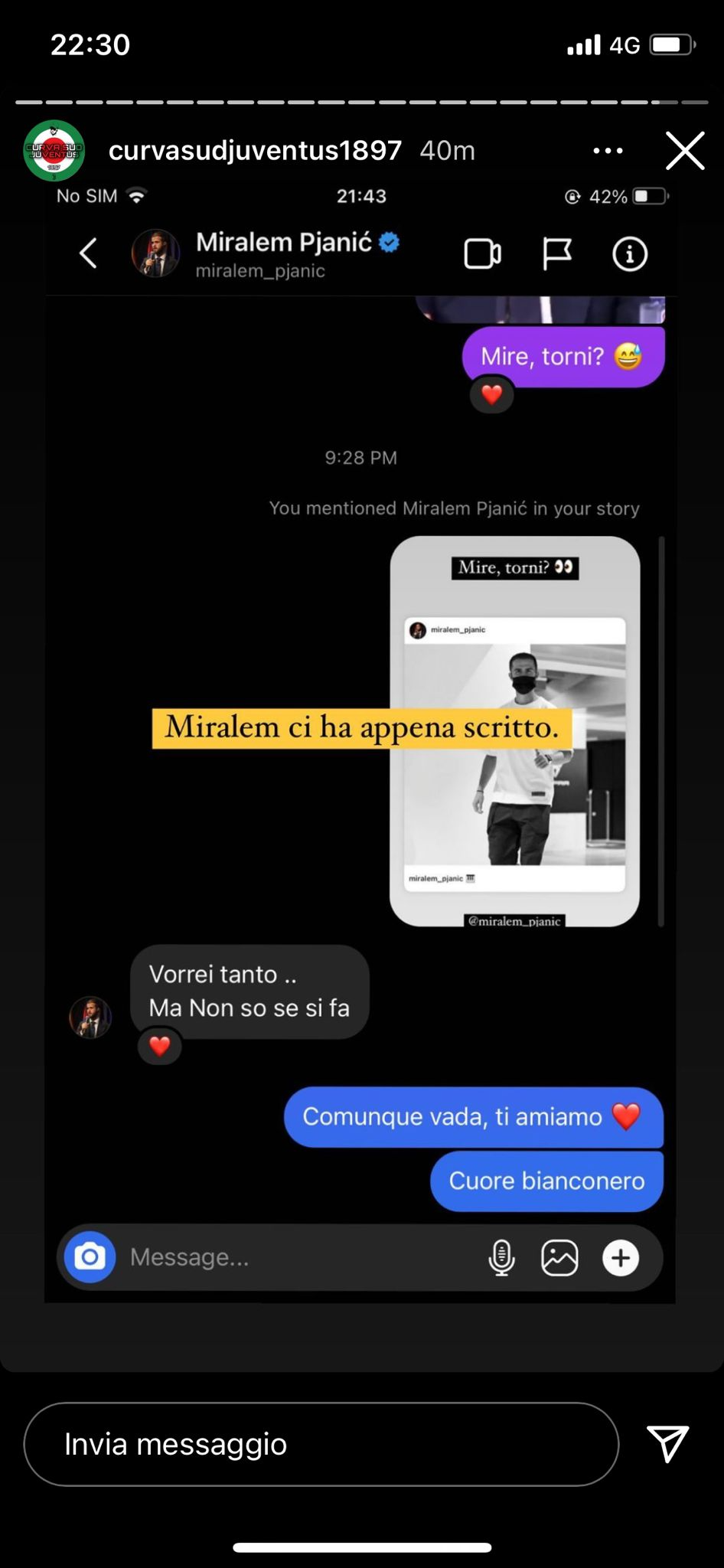 “Vorrei tanto, ma non so se si fa”, ha scritto Miralem.
