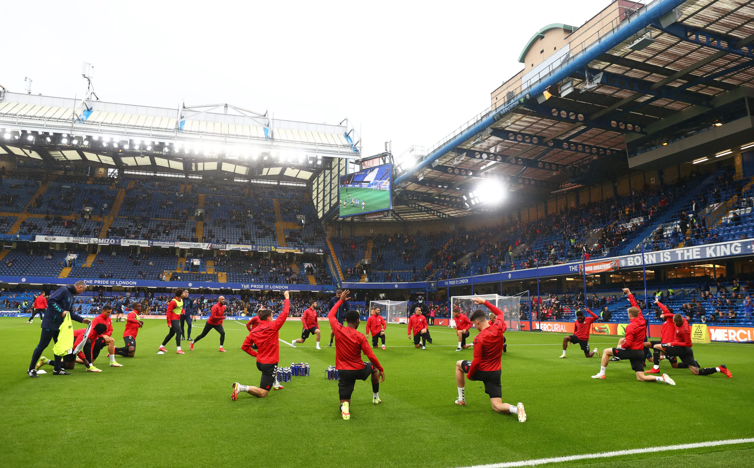 LONDON, ENGLAND - OCTOBER 02: Southampton players warm up prior to the Premier League match between Chelsea and Southampton at Stamford Bridge on October 02, 2021 in London, England. (Photo by Clive Rose/Getty Images)