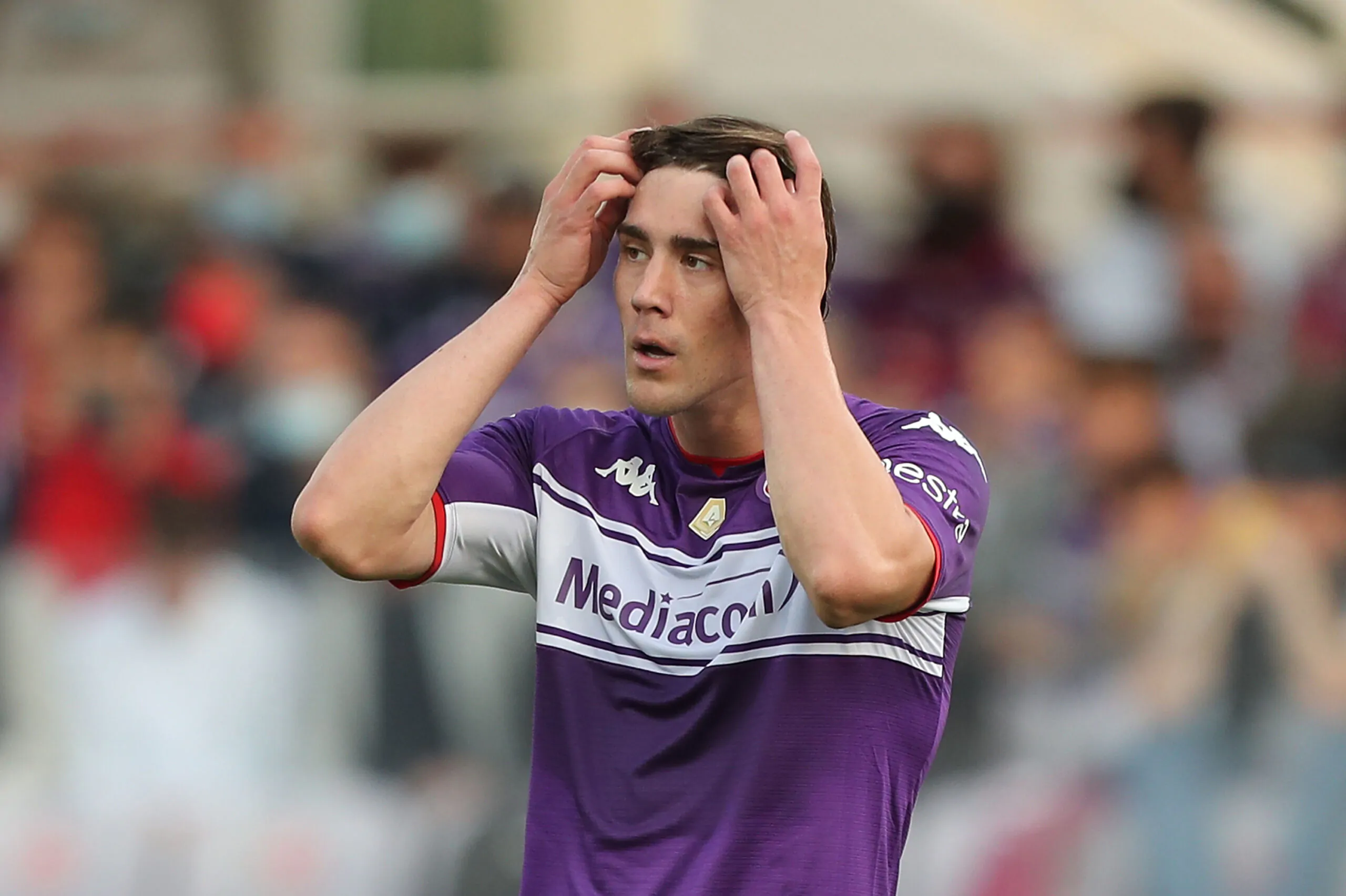 FLORENCE, ITALY - OCTOBER 31: Dusan Vlahovic of ACF Fiorentina reacts during the Serie A match between ACF Fiorentina and Spezia Calcio at Stadio Artemio Franchi on October 31, 2021 in Florence, Italy. (Photo by Gabriele Maltinti/Getty Images)