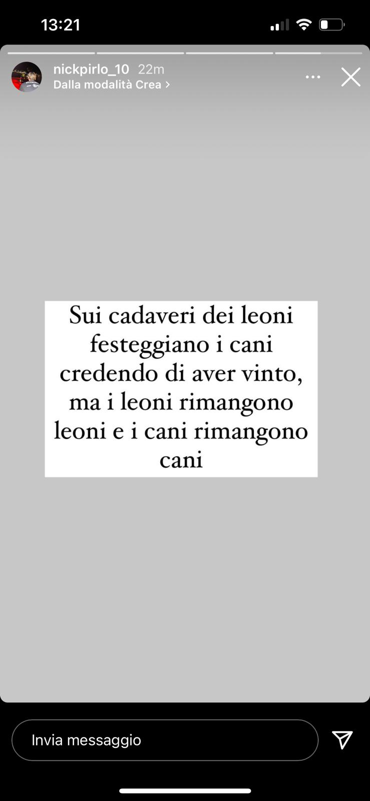 Il figlio di Andrea Pirlo, su Instagram ha postato una frase abbastanza indicativa: “Sul cadavere dei leoni festeggiano i cani credendo di aver vinto, ma i leoni rimangono leoni e i cani rimangono cani”.