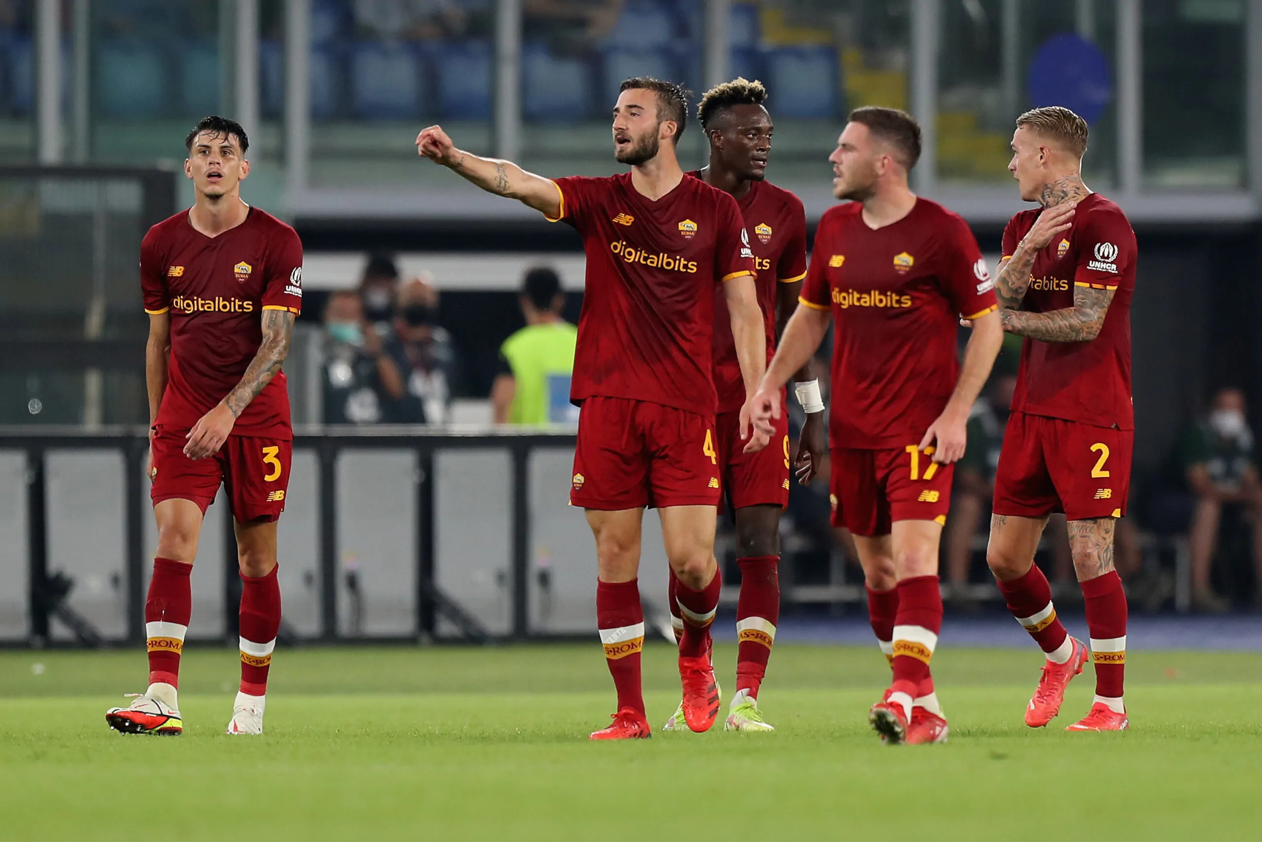 ROME, ITALY - SEPTEMBER 12: Bryan Cristante #4 with his teammates of AS Roma celebrates after scoring the opening goal during the Serie A match between AS Roma and US Sassuolo at Stadio Olimpico on September 12, 2021 in Rome, Italy (Photo by Paolo Bruno/Getty Images)