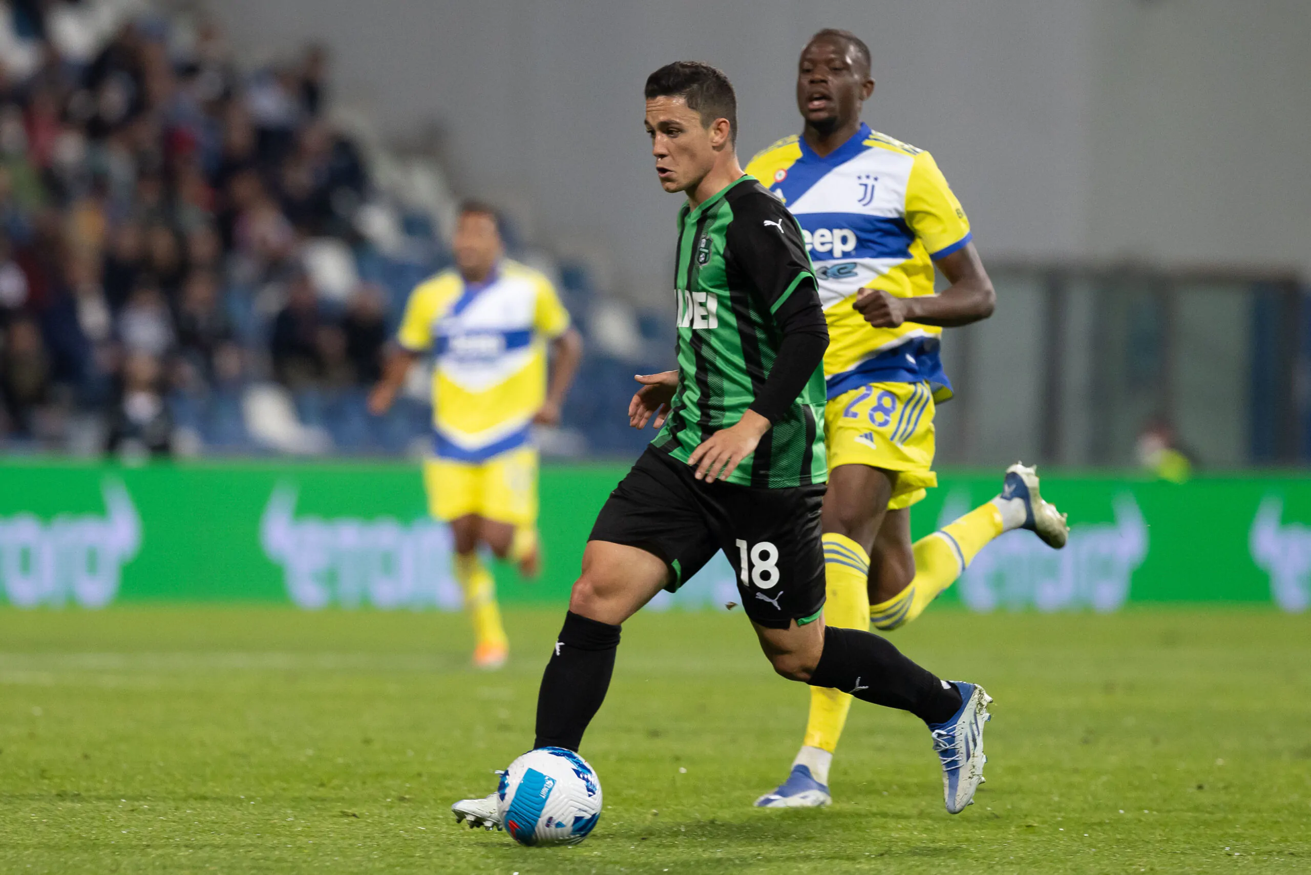REGGIO NELL'EMILIA, ITALY - APRIL 25: Giacomo Raspadori of US Sassuolo in action during the Serie A match between US Sassuolo and Juventus at Mapei Stadium - Citta' del Tricolore on April 25, 2022 in Reggio nell'Emilia, Italy. (Photo by Emmanuele Ciancaglini/Getty Images)