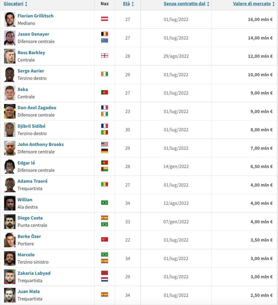 Tra i calciatori che conoscono bene il nostro campionato menzioniamo Josip Ilicic, il quale ha rescisso con l’Atalanta. Ma anche Simone Zaza e gli ex Napoli Ghoulam e Malcuit. Infine, per chi fosse alla ricerca di un portiere, tra gli svincolati occhio all’ex Liverpool Loris Karius.