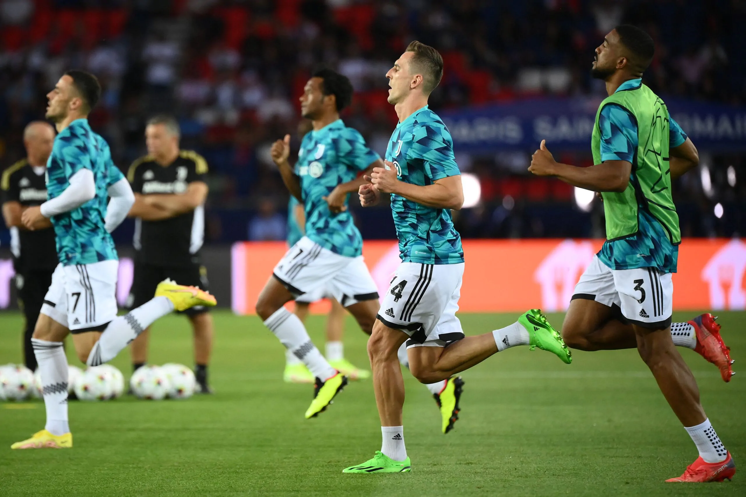 Juventus' Polish forward Arkadiusz Milik (C) and teammates warm up prior to the UEFA Champions League Group H first leg football match between Paris Saint-Germain (PSG) and Juventus at Parc des Princes Stadium in Paris, on September 6, 2022. (Photo by FRANCK FIFE / AFP) (Photo by FRANCK FIFE/AFP via Getty Images)