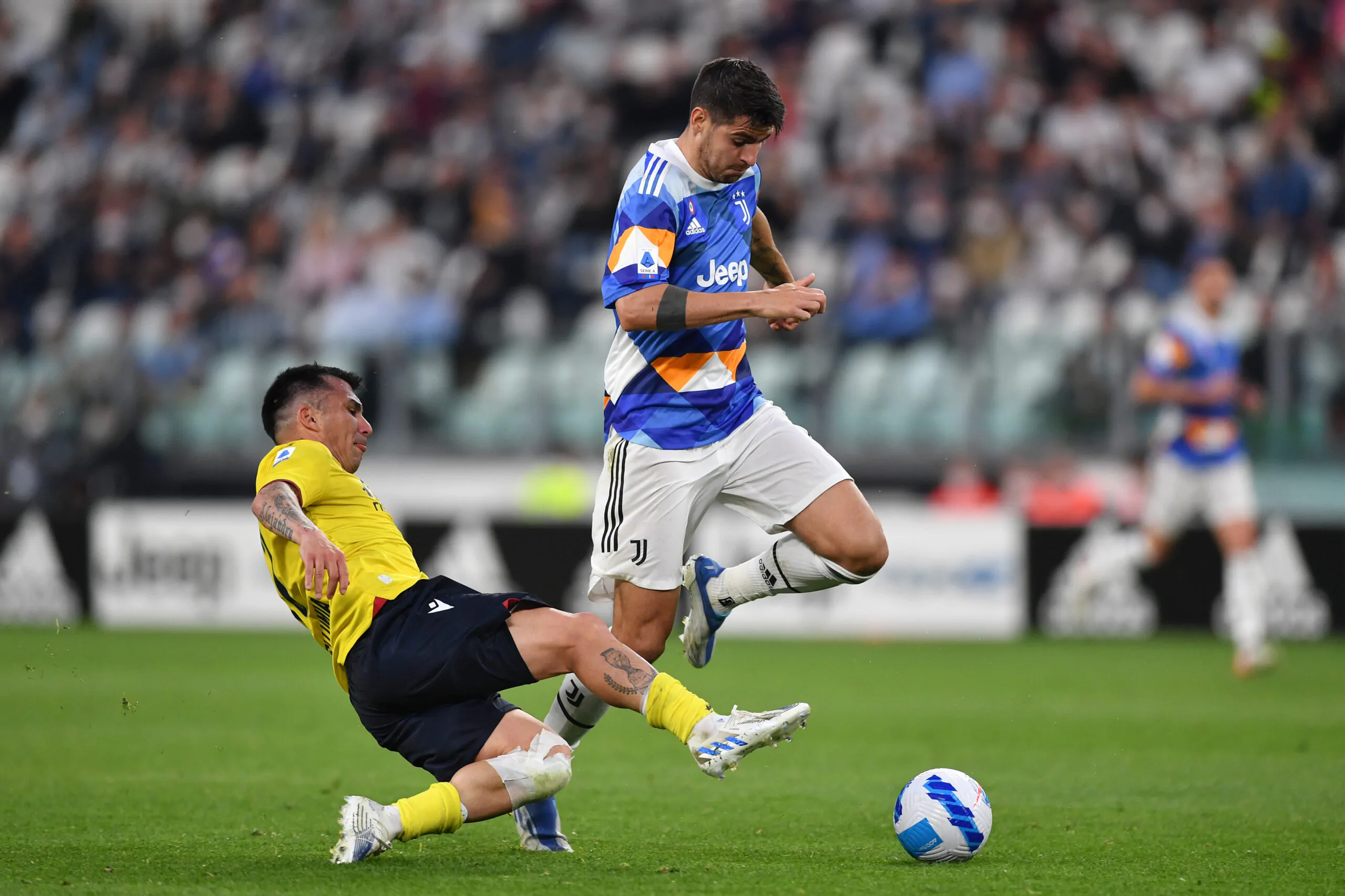 TURIN, ITALY - APRIL 16: Alvaro Morata of Juventus is challenged by Gary Medel of Bologna during the Serie A match between Juventus and Bologna FC at Allianz Stadium on April 16, 2022 in Turin, Italy. (Photo by Valerio Pennicino/Getty Images)