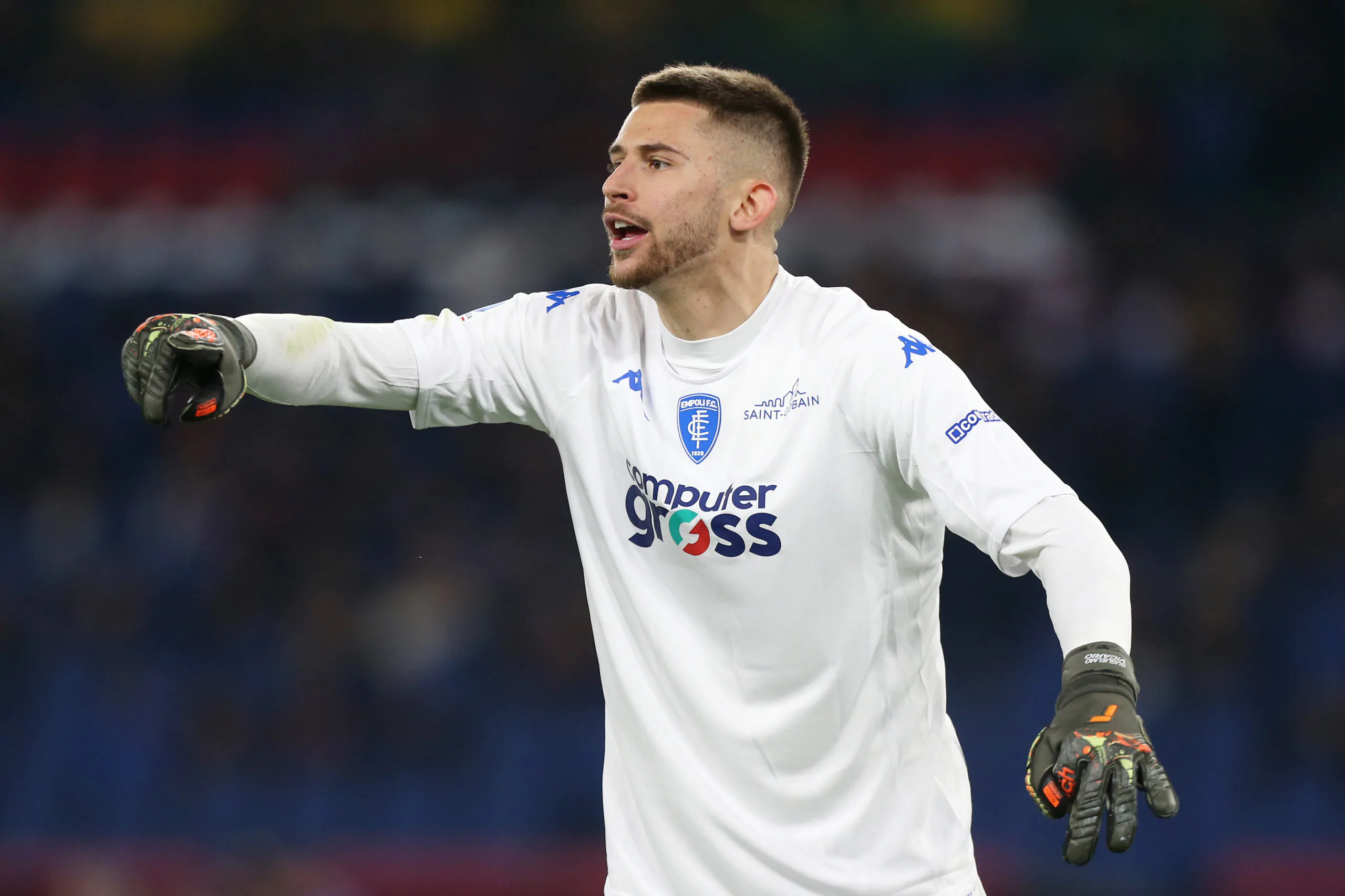 ROME, ITALY - FEBRUARY 04: Guglielmo Vicario of Empoli FC reacts during the Serie A match between AS Roma and Empoli FC at Stadio Olimpico on February 04, 2023 in Rome, Italy. (Photo by Paolo Bruno/Getty Images)