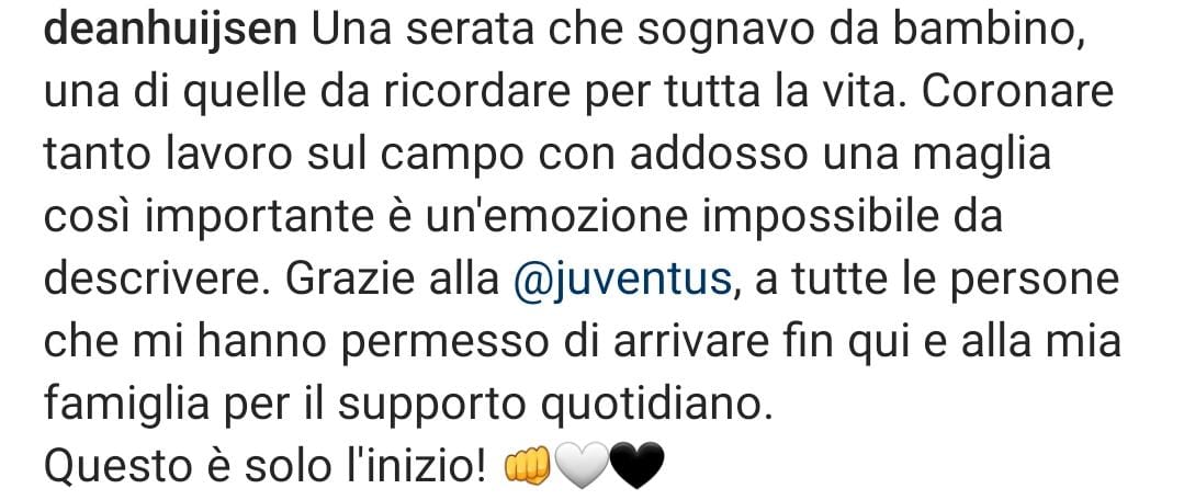 Una serata che sognavo da bambino, una di quelle da ricordare per tutta la vita. Coronare tanto lavoro sul campo con addosso una maglia così importante è un’emozione impossibile da descrivere. Grazie alla Juventus, a tutte le persone che mi hanno permesso di arrivare fin qui e alla mia famiglia per il supporto quotidiano.